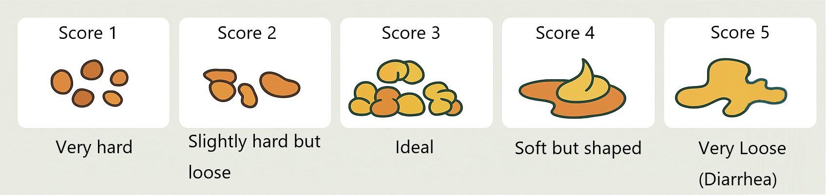 | More loose or unformed feces (score 4–5); signs of digestive imbalance. | Mostly well-formed feces (score 3); indicate healthy digestion and absorption. |